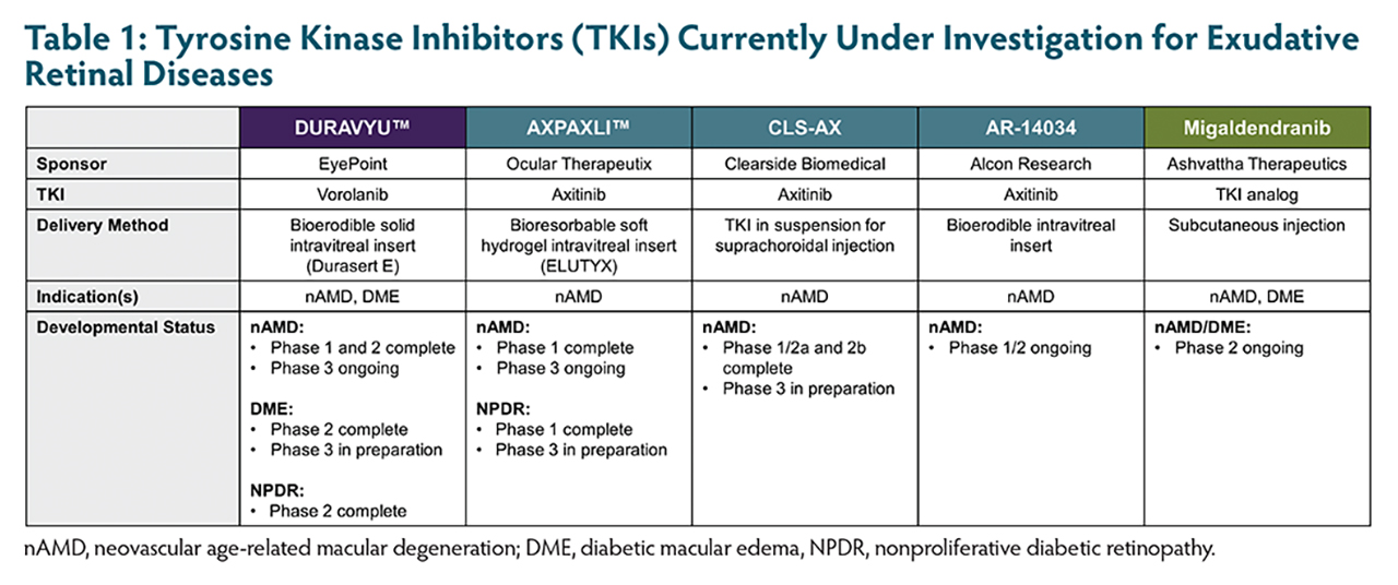 Anti–vascular endothelial growth factor (VEGF) therapy is the current standard of care for exudative retinal diseases. However, new treatments including small-molecule tyrosine kinase inhibitors (TKIs) are being investigated to address unmet needs and to expand treatment options. This article summarizes the current data and future directions for investigational TKIs.