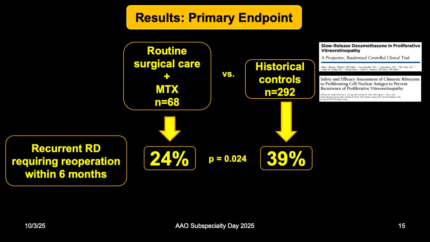 Surgeons managing proliferative vitreoretinopathy (PVR) may soon have stronger evidence to support adjunctive intravitreal methotrexate, according to results presented at the 2025 American Academy of Ophthalmology (AAO) meeting. In the phase 3 GUARD clinical trial, eyes treated with intravitreal methotrexate 0.8% (ADX-2191; Aldeyra Therapeutics) experienced fewer postoperative complications, including lower rates of hypotony and cystoid macular edema (CME), compared with historical controls.