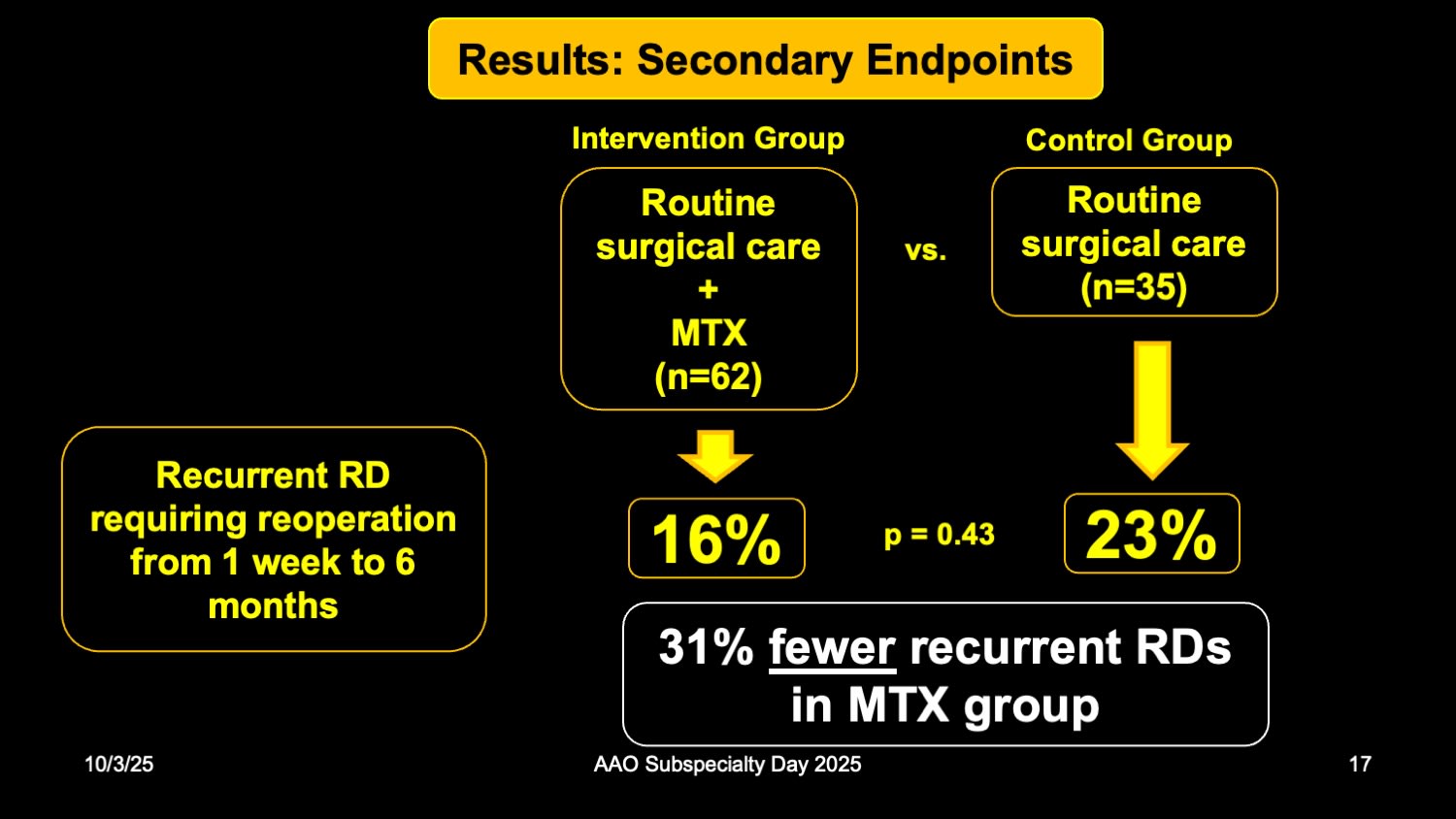 Christina J. Flaxel, MD, of the Casey Eye Institute at Oregon Health and Science University (OHSU) in Portland, a GUARD investigator, presented the data during Retina Subspecialty Day in Orlando, Florida. Disclosing that Aldeyra had provided a research grant to OHSU, she described the trial design, outcomes, and safety profile for this investigational formulation of methotrexate used during PVR repair.