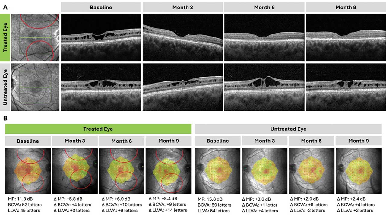 Figure 2. Structural and functional changes in a patient treated with ATSN-201 (Atsena Therapeutics). ATSN-201 was delivered by subretinal injection to the right eye in 2 blebs (bleb locations shown in red). Foveal schisis closure was observed in the treated eye by month 3 and has persisted through at least month 9, demonstrating the durability of the treatment effect; schisis closure was not observed in the untreated eye at any time point (A). The treated eye also demonstrated functional improvements on microperimetry (MP), best-corrected visual acuity (BCVA), and low-luminance visual acuity (LLVA) relative to the untreated eye (B). MP threshold was calculated as the average of 5 loci with the lowest sensitivity at baseline, using a 19 dB cutoff and including additional loci if there was a tie.