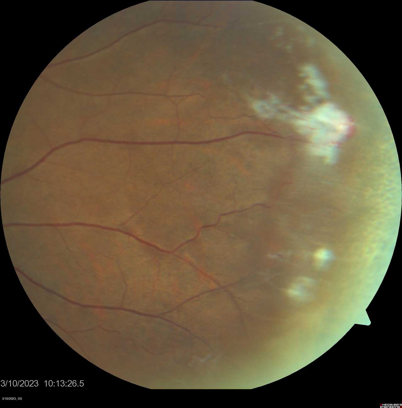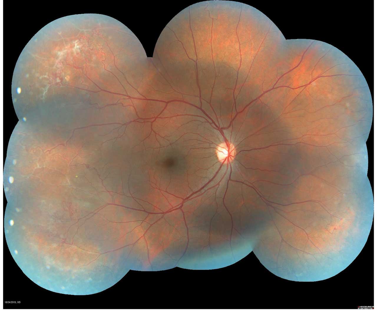 Figure 1. Montage color fundus photograph of proliferative sickle cell retinopathy showing peripheral sea fan neovascularization. Photo by Katie Lachut-Yevich/VCU Health System.