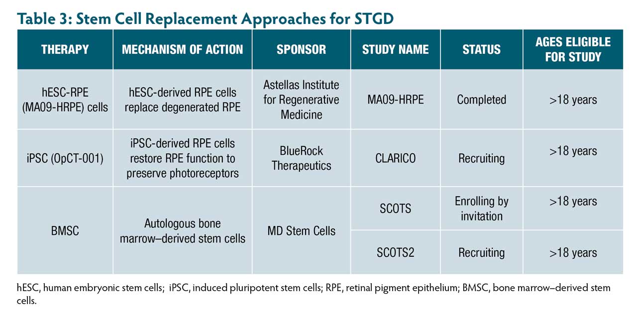 More recently, BlueRock Therapeutics initiated the OpCT-001 trial to evaluate iPSC-derived RPE in humans, with completion expected in 2030.33 In parallel, autologous bone marrow–derived stem cell (BMSC) therapy showed functional improvement in 61.8% of eyes with STGD in the Stem Cell Ophthalmology Treatment Study (SCOTS and SCOTS2), with no adverse events reported.34 The ongoing SCOTS2 trial, through 2027, will further evaluate long-term safety and efficacy.35