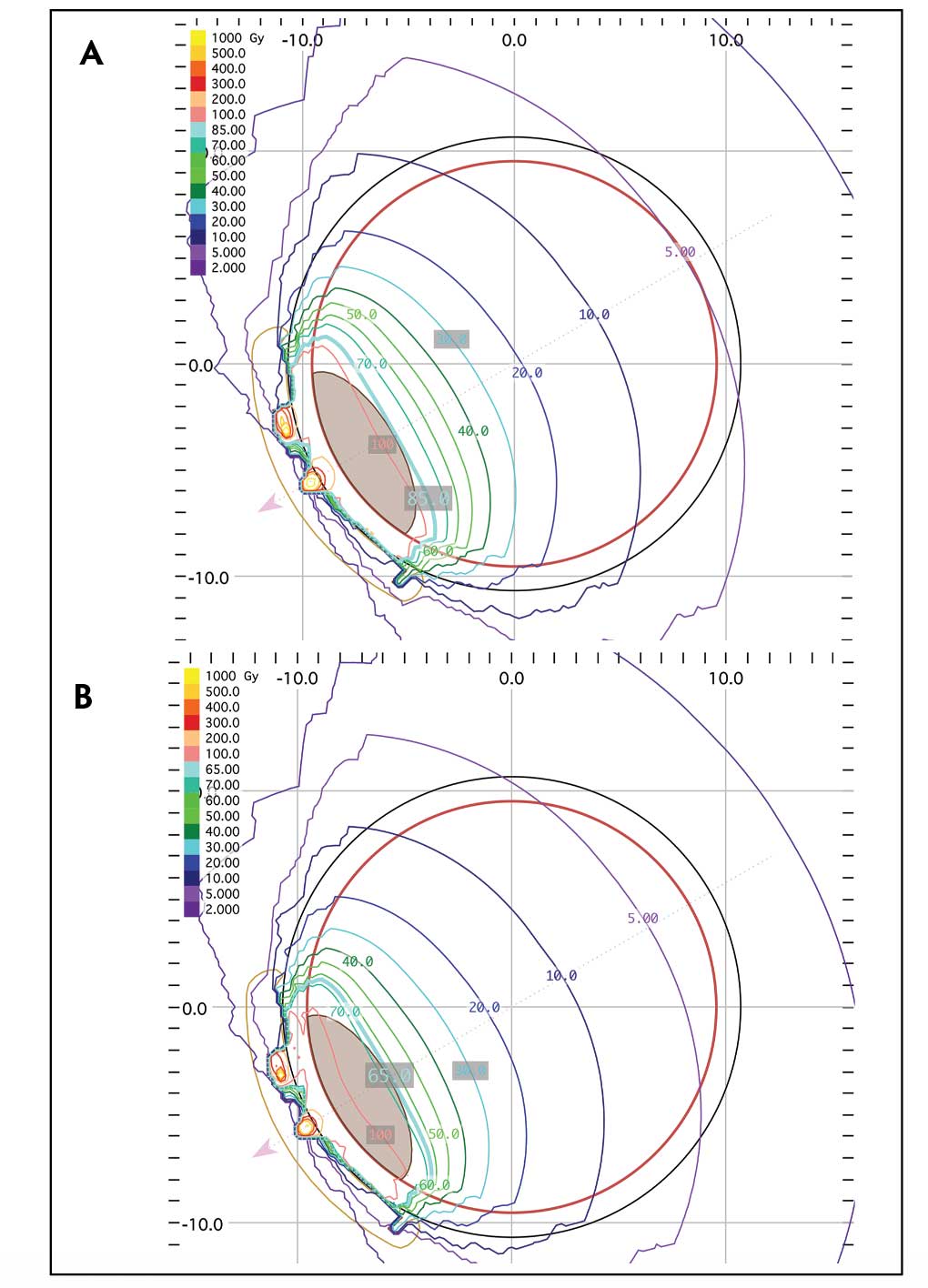Figure 3. Radiation treatment planning using an EP 917 plaque (IsoAid) considered apical doses of 85 Gy (A) and 65 Gy (B). Lowering the dose to 65 Gy decreased the radiation exposure to the optic disc from 44 Gy to 33 Gy, a 25% reduction, as illustrated by the isodose curves focusing closer to the tumor.