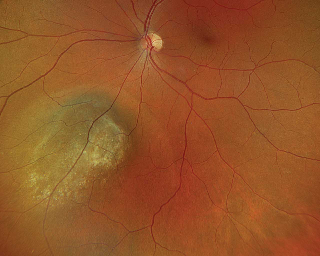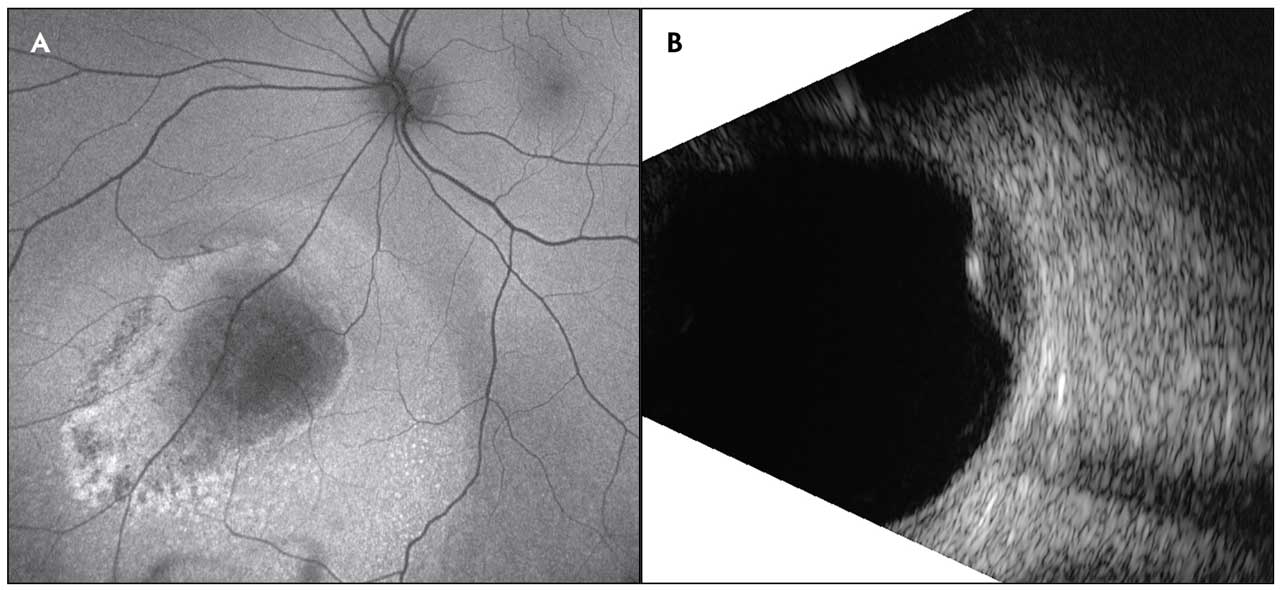 Figure 1. A 56-year-old male undergoing a routine eye exam was found to have a choroidal melanoma in the left eye.