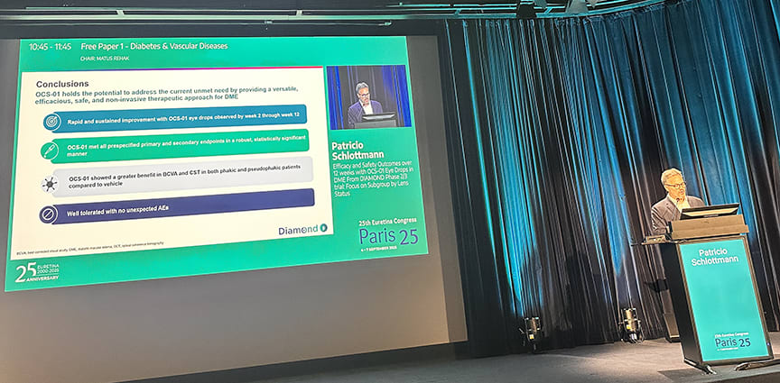Patients with diabetic macular edema (DME) treated with OCS-01 eye drops (Oculis) demonstrated rapid and sustained improvements in best-corrected visual acuity (BCVA) and retinal thickness in the initial stage of the DIAMOND-1 phase 2/3 trial, Patricio G. Schlottmann, MD, reported at the 2025 European Society of Retina Specialists (Euretina) congress in Paris.
