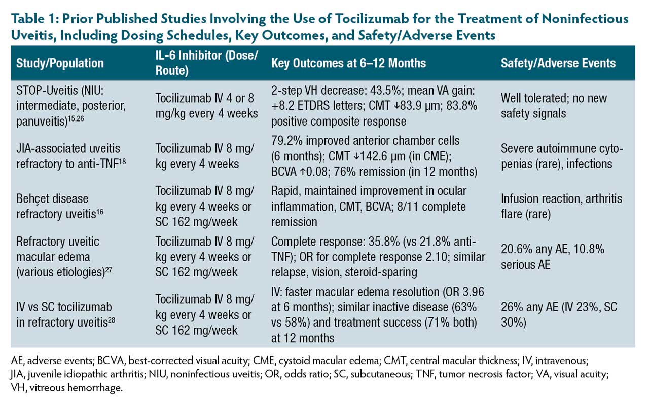 15. Sepah YJ, Sadiq MA, Chu DS, et al. Primary (month 6) outcomes of the STOP-Uveitis Study: evaluating the safety, tolerability, and efficacy of tocilizumab in patients with noninfectious uveitis. Am J Ophthalmol. 2017;183:71-80. doi:10.1016/j.ajo.2017.08.019