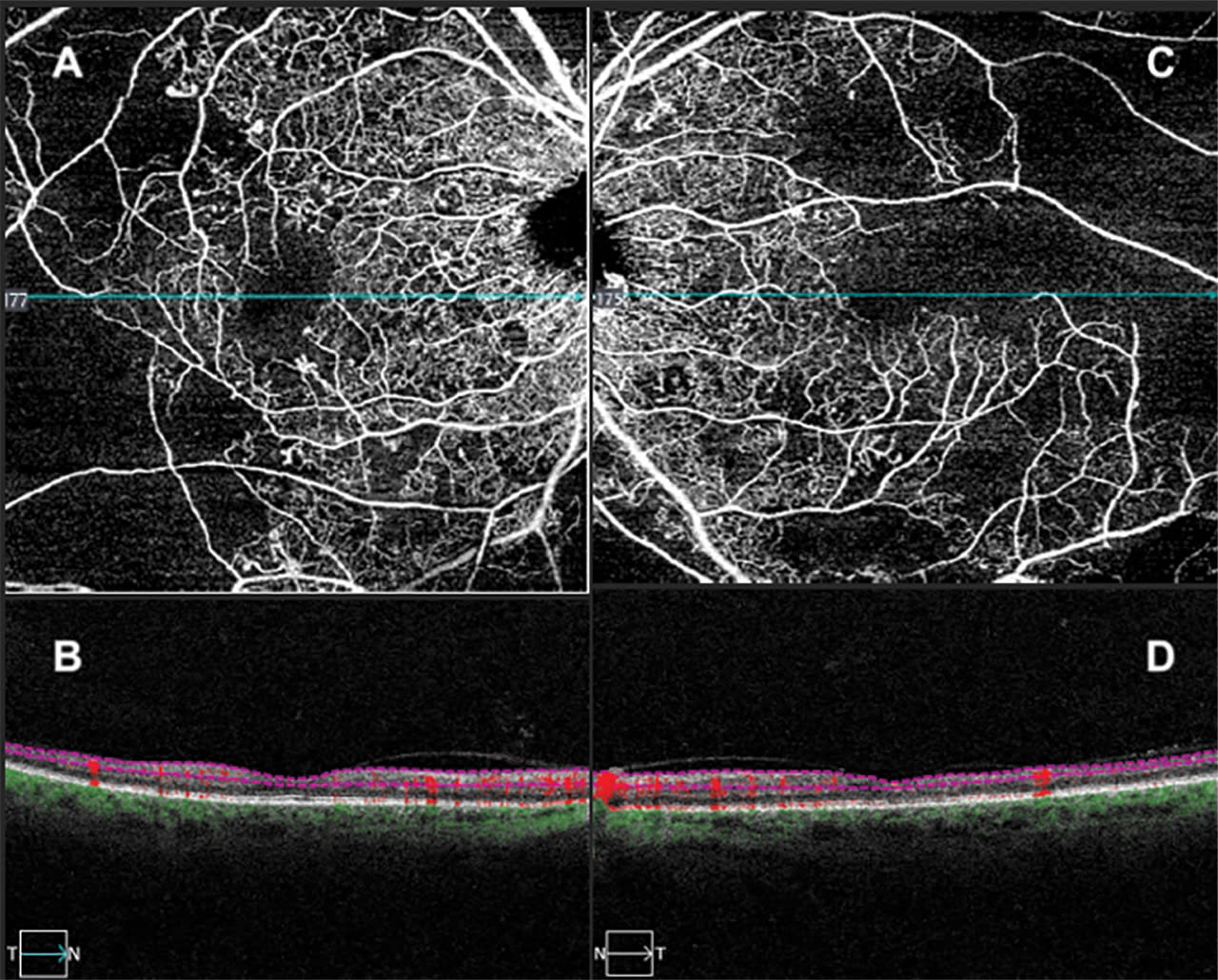 Figure 1. In a 55-year-old male with diabetic retinopathy, swept-source optical coherence tomography angiography 6x6 mm scans show an enlarged, irregular foveal avascular zone demonstrating ischemic maculopathy as well as profound capillary dropout in the superficial plexus of the right eye (A, B) and left eye (C, D).