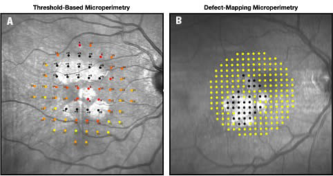 Figure 1. Comparison of (A) standard threshold-based microperimetry, which uses multiple stimulus presentations at fewer locations (68 points), and (B) novel defect-mapping microperimetry (DMP), which uses single suprathreshold stimuli presentations at a greater number of locations (208 points) in eyes with geographic atrophy. Note that DMP evaluated more than 3 times as many locations, while requiring approximately half the test duration of threshold-based microperimetry; with equivalent testing time, a DMP test would evaluate approximately 6 times as many locations.