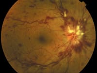 Histopathologic data suggests that CRVO (Figure 3) arises from thrombosis of the central retinal vein in the vicinity of the lamina cribosa.19 Here the close juxtaposition of the artery and vein may lead to compression-induced changes in the vein, turbulence, endothelial cell damage, and eventual thrombosis.20,21 The location of the thrombus relative to the lamina cribosa may be related to the risk of ischemia; an occlusion posterior to the lamina may provide more venous collateral channels and hence improved perfusion.22