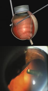 | Figure 2. With slit illumination, the surgeon can analyze vitreous traction and then adapt the surgical strategy. | |