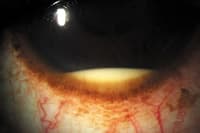 Ocular Behçet's disease may affect anterior and posterior segments of the eye. The disease is mostly bilateral and has a recurrent explosive course. Anterior uveitis is seen frequently with an associated hypopyon (Figure 3) in about one third of patients. Retinal involvement, which may lead to blindness is the most concerning aspect of Behçet's disease. Recurrent retinal vasoocclusive episodes may lead to macular ischemia. Bilateral central retinal vein thrombosis has been described. Areas of retinal hemorrhages and edema, with intense vitritis can be seen. The retinitis often has the appearance of a virally induced lesion. Fluorescein angiography may show areas of capillary dropout and vascular tree rearrangement. The loss of a clearly defined capillary-free zone is common.