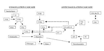 Uncontrolled coagulation is regulated by natural anticoagulant mechanisms. Protein C is a main physiologic anticoagulant that shifts thrombin's procoagulant role into an anticoagulant one. Thrombomodulin, secreted by activated endothelium, platelets, neutrophils, serves as an endothelial receptor for thrombin. This resultant complex then converts inactivated PC to its active moiety, activated PC (APC). The APC with its cofactor PS (free active form not bound to complement protein) assembles on the endothelium cell PC receptor (EPCR), inactivating factors FVa and FVIIIa , and inhibiting the conversion of factor X to factor Xa and of prothrombin to thrombin. Activated PC also reduces thrombin's induced activation of platelets and stimulates fibrinolysis by inactivation of plasminogen activator inhibitor-1 (PAI-1).