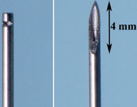 Figure 1. Unlike a needle (right), the 25-g aspiration cutter (left) is blunt at its end and sides. |
