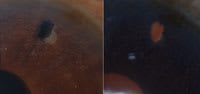 Figure 3. Left: An FIT iridotomy with its characteristic scalloped edges. Right: A bright transillumination shadow reveals that it is patent. |