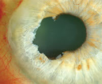 | Figure 4. A slit-lamp photograph, taken 1 day after FIT iridectomy, reveals a surgically enlarged ovoid pupil. The cornea is clear with minimal subconjunctival hemorrhage. |