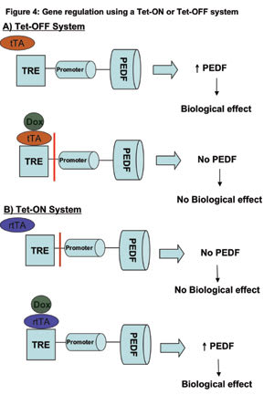 ■Appropriate passenger genetic material (eg, switches or tissue/physiological specific promoters). See details of the Tet-ON or Tet-OFF system above and in Figure 4. Physiological promoters represent another attractive way of regulating local protein production. For example, in principle one can fine-tune the level of VEGF expression to the amount of VEGF by tying the expression levels of anti-VEGF agents to the presence of an upstream modulator of VEGF production, such as the HRE which controls VEGF production.7 An HRE responsive promoter sequence can be placed on the delivered gene, resulting in an anti-VEGF protein such as Flt-1, the soluble VEGF receptor, being produced. This type of system effectively creates a local auto-regulatory pathway (Figure 3).