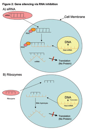 ribozymes). A. The therapeutic siRNA is delivered and enters the cell by endocytosis in a vector or liposomal system. The siRNA binds to host RNA-induced silencing complex (RISC) in the cell. This complex loses a strand from the siRNA, which then binds with host cell messenger RNA. This cleaves the host mRNA and prevents protein production. B. Ribozymes are small RNA molecules, generally of a "hammerhead" or "hairpin" configuration. They bind to specific cleavage sites on host messenger RNA and make them more susceptible to intracellular RNA hydrolases. Messenger RNA is cleaved and protein translation does not occur. |