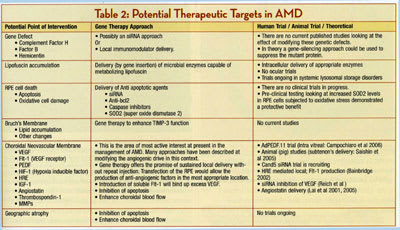 ■Gene Therapy for Geographic Atrophy. In AMD, changes lead to the accumulation of intracellular (RPE) lipofuscin and extra cellular deposits (drusen and basal laminar deposits) that contain complement complexes and other inflammatory markers19. These lead to alterations in the nature and thickness of Bruch's membrane and oxidative stress,20 leading to cellular changes in the RPE, inducing apoptosis with secondary neural retinal degeneration. An approach in geographic atrophy may be to introduce therapeutic genes into the host RPE to enhance their survival in this environment. This may be achieved in this environment using virally delivered anti-apoptotic factors eg, super-oxide dismutase 2 (SOD2); caspase inhibitors or agents that will increase resistance to apoptosis such as integrins (eg, av�3).