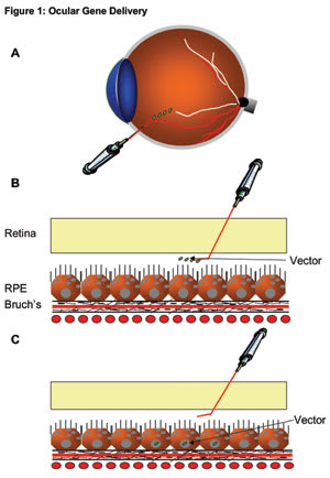 Delivery of the vector is an important consideration in gene therapy. The issues to be considered include safety, efficacy, reproducibility, and convenience. When considering vector delivery for eye disease, the following routes are most commonly considered: