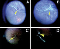 Wide-angle viewing systems and powerful light sources allow access to the far peripheral retina and ciliary body, but they often require scleral depression. Ophthalmic endoscopes can provide complete assessment of the pars plana in its natural state without scleral depression, and they can extend surgical control where standard microscopic views are limited. In complicated cases of proliferative vitreoretinopathy and iris neovascularization, where a small pupil, hyphema, or opaque posterior capsule can prevent complete visualization even with standard and panoramic contact lenses ophthalmic endoscopy can augment control in the retroirideal area.12 When used in conjunction with intraoperative fluorescein angiography, vitreoretinal endoscopy can identify pathologic areas in the pars plana and aid in intraoperative evaluation and further surgical treatment of complicated diabetic retinopathy.13,14 Endoscopy can also facilitate the management of complications of cataract surgery. It is used to visualize retained lens fragments that can be embedded in the vitreous base and to provide precise haptic placement in posteriorly dislocated intraocular lens implants.15,16 The learning curve can be steep as the surgeon's view is via television screen and therefore lacks stereopsis. However, new technology with high-definition televisions and 3-D software can now provide high-resolution stereoscopic views.17