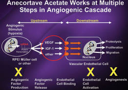 "Anecortave acts differently than other antiangiogenesis molecules. It reduces the mRNA translation and production of molecules such as VEGF and insulin-like growth factor-1," he continued. "In addition, and very importantly, it acts downstream, within the interior of the cell, independently of initiating stimuli, preventing generation of matrix metalloproteinases, which are critical for the breakdown of the extracellular matrix and resultant neovascularization."