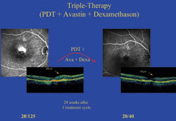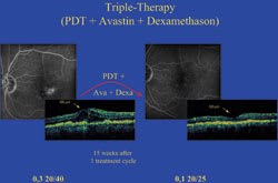 ► Triple therapy with verteporfin (Visudyne, Novartis, QLT) photodynamic therapy (PDT), bevacizumab (Avastin, Genentech) and dexamethasone, Albert J. Augustin, MD
