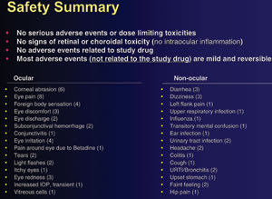 "The safety in this study was excellent," Dr. Kaiser said. No patients were withdrawn due to adverse events. The most commonly reported ocular adverse events were injection-related, such as subconjunctival hemorrhage, ocular pain and vitreous floaters, and described as mild. Blood samples were obtained from all patients at 30 minutes and 24 hours following injection. The plasma samples obtained were assayed for levels of bevasiranib, which was not detected in any of the samples at all five dose groups.