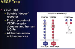 Dr. Kaiser presented an update on the investigational drug VEGF Trap for the treatment of neovascular AMD. VEGF Trap is a fusion protein that binds all forms of vascular endothelial growth factor-A (VEGF-A) and placental growth factor (PlGF). It is designed to prevent formation of new blood vessels by preventing the growth factors from interacting with cell-surface receptors.