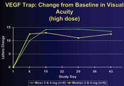 In addition, it effectively binds VEGF at low ambient concentrations. "By combining the levels we get at 1 month and longer with its very high ability to bind VEGF, maybe we can get a much longer duration of action with VEGF Trap than we are seeing with other drugs," he said.
