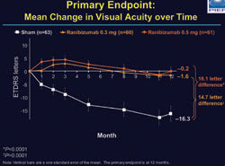 The study met its primary efficacy endpoint by preventing vision loss as measured by mean change in best-corrected visual acuity (BCVA) from baseline to month 12 (Figure 1). On average, at month 3, patients in the 0.3-mg treatment group gained 2.9 letters; patients in the 0.5-mg treatment group gained 4.3 letters; and patients in the sham group lost 8.7 letters. At month 12, on average, patients in the 0.3-mg treatment group lost 1.6 letters; patients in the 0.5-mg treatment group lost 0.2 letters; and patients in the sham group lost 16.3 letters (p<0.0001).