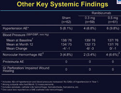 No deaths or Antiplatelet Trialists' Collaboration arterial thromboembolic events, including myocardial infarctions or cerebral vascular events, occurred. Describing other systemic findings, Dr. Brown said ranibizumab appeared to have a hypotensive effect in the 0.3-mg group (Figure 3), but "the important finding is that it was not increasing." Also, at this point, it is not known why no patients in the ranibizumab treatment groups were immunoreactive at screening, but two patients in the 0.5-mg group were at month 12, Dr. Brown said.