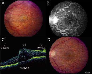 Figure 1 (a) Color photograph OS of a patient 1 week following trabeculectomy surgery. Visual acuity is HM at 3 feet, and the IOP is 3 mm Hg. The disc edema, retinal vascular tortuosity, diffuse retinal folds, and macular edema are all features compatible with hypotony maculopathy. (b) Fluorescein angiogram confirms the clinical findings. (c) OCT shows diffuse macular thickening. (d) Color photograph OS taken 5 weeks later following restoration of normal IOP. The majority of the retinal folds have resolved, along with the macular edema. Vision has improved back to 20/30.