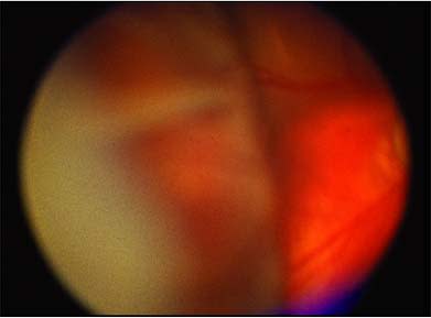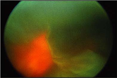 Figure 3. Suprachoroidal hemorrhage occurred 5 days following glaucoma filtration surgery. It was managed conservatively with observation. The hemorrhage resolved over a 3-week time frame, leaving behind moderate retinal pigment mottling.