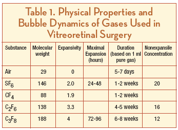 One of the earliest descriptions of vitreous substitutes dates to 1911 when Ohm treated retinal detachment with injection of sterile air into the vitreous cavity.1 However, it was Rosengren who established the concept of internal gas tamponade in 1938.2 Due to the high surface tension of the gas bubble, an effective seal of the retinal break can be established, allowing the retinal pigment epithelium (RPE) to pump the subretinal fluid into the choroids and re-establish the natural retinal architecture.3 The buoyancy of the bubble helps to push the retina against the scleral wall while the surface tension prevents breakup of the bubble and entering of the subretinal space. For this tamponade to be effective with low-volume gas fills, such as those used during pneumatic retinopexy, the patient needs to be positioned so that the retinal break is located at the apex of the eye.