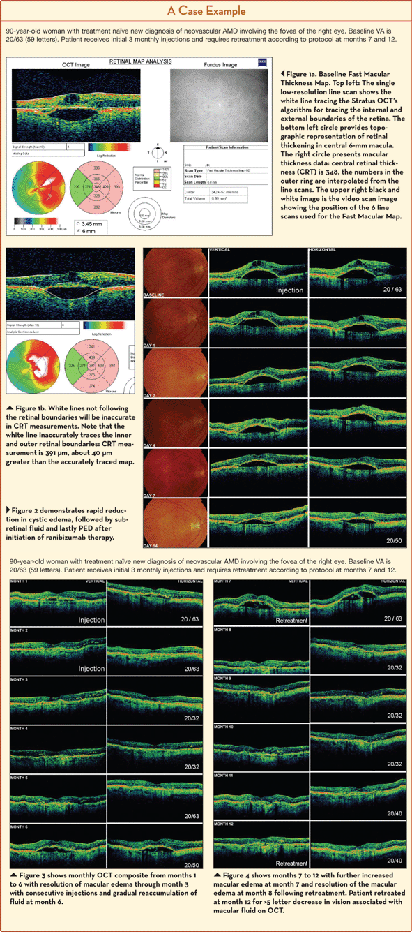 Visual acuity measurements, clinical examination, and OCT evaluations are all that appear to be necessary for the successful management of neovascular AMD patients treated with intravitreal ranibizumab. A head-to-head trial comparing this OCT-guided variable dosing regimen with fixed monthly dosing is required to demonstrate that the 2 strategies result in comparable VA outcomes. However, until this study is done, it seems reasonable to use VA with fast and slow OCT scans to monitor the response to therapy and determine whether retreatment with ranibizumab is necessary.