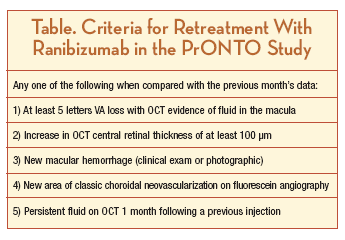 A review of those patients retreated based on criteria of new intraretinal hemorrhage or new classic component on FA revealed that all patients exhibited qualitative changes on OCT consistent with recurrent fluid. For this reason, a sixth criterion for reinjection has been added to the PrONTO study for the remainder of the second year: patients will be retreated with ranibizumab for any qualitative change on OCT suggesting new fluid in the macula including the reappearance of cysts or subretinal fluid or an increase in size of a PED.