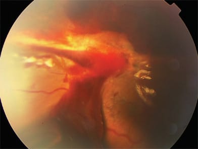 If the diagnosis of a scleral rupture has been made or its presence is highly likely, all further diagnostic manipulations should be kept to the absolute minimum and the patient should be prepared for urgent surgery.14 These precautions are important to prevent the most feared complication, an expulsive choroidal hemorrhage (Figure 1). It is particularly important that the repair of associated orbital fractures is delayed until the condition of the globe is evaluated (open wound). If the presence of an occult scleral rupture cannot be excluded, exploratory (diagnostic) surgery is preferred to observation.