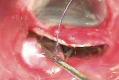 An assistant's help is very important during closure of a posterior scleral wound. The assistant can carefully turn the globe, keep orbital tissues from blocking view and access, and hold back prolapsing intraocular tissues with a spatula. If the wound is under the insertion of the extraocular muscle, the muscle may have to be temporarily disinserted. The surgeon should be careful not to lose the muscle.