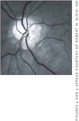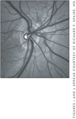 Figure 4. In this color photograph, the optic nerve drusen appear as globular, yellowish nodules on the surface of the optic disc (left).