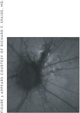 Figure 6. This image of optic nerve drusen autofluorescence shows that these hyaline bodies are highly autofluorescent.
