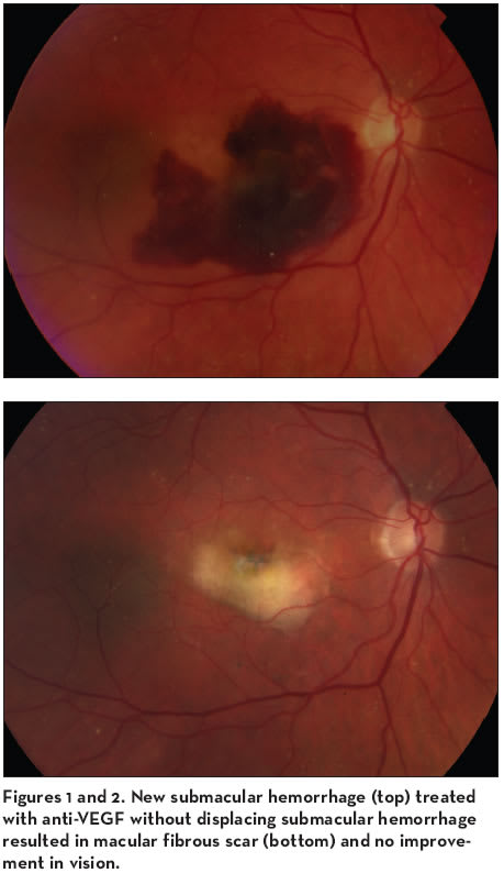 Another consideration is that even with successful management of a submacular hemorrhage, the choroidal neovascular membrane and the disease process of AMD is not ameliorated. Subfoveal blood is an anatomic problem that has an underlying metabolic etiology. Even after the blood is cleared and the vision returns, patients may have further vision loss from recurrent CNV.