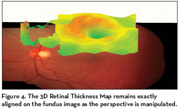 also distinguishes itself with its dynamic 3- D anatomy imaging, which facilitates a full volume view, extracted from any specific scan area of the retina and disc. The elevated 3-D image changes as the operator scrolls through each slit view reflecting anatomic information corresponding with the fundus image. (Figure 4). Ophthalmologist Edward R. Thomas,MD, FACS, of Dayton, Ohio, explains that this interactive feature enables free movement and assessment across the entire grid pattern of the scanned retina along 3 axes options.