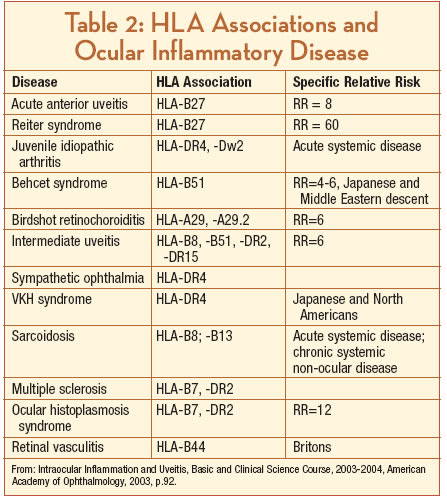 All animals with leukocytes express a family of cell surface glycoproteins called major histocompatibility complex (MHC) proteins. In humans the MHC proteins are called human leukocyte antigen (HLA) molecules. HLA genes are located on the short arm of chromosome 6. Some uveitis syndromes are associated with the possession of certain HLA types (Table 2).32 Despite the fact that numerous studies have revealed an association between various HLA antigens and uveitis syndromes, the mechanism underlying the development of these syndromes remains unknown.With further investigation we may be able to characterize genetic susceptibilities for individual uveitis syndromes and, from this, gain insights into the molecular mechanisms of their pathogenesis.