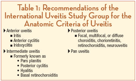 retinal detachment, corneal opacities, optic-nerve atrophy, and phthisis. Uveitis may occur at any age, but it most commonly affects individuals between 20 and 59 years of age.5,8-11 Uveitis in children younger than 16 years old accounts for only 5% to 10% of cases.12 Childhood uveitis is associated with unique diagnostic and management issues, tendency for chronic disease, and high complication rates.13 In 1 study, the most frequent complication was cataract, followed by glaucoma, with 2% suffering bilateral legal blindness and 17% with unilateral legal blindness.14 In this article, we will review the diagnosis of, comanagement of, and current therapy for uveitis. This discussion is limited mainly to noninfectious forms of the disease.