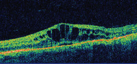 ▪ Optical coherence tomography. Optical coherence tomography (OCT) is currently one of the most important imaging techniques used in the study of uveitis. It enables imaging of the optic nerve head, nerve fiber layer, retina, choroid, and the vitreoretinal interface in a noncontact and noninvasive manner. It can be repeated as often as necessary since there are no serious side effects in OCT testing. OCT can be used to quantify macular thickening and thus is an excellent way of diagnosing CME and monitoring the effectiveness of treatment (Figure 6).41,42 OCT can detect vitreoretinal interface disorders such as epiretinal membranes, macular holes, and vitreomacular traction, which can assist in management.43-45 OCT is also valuable in the study of the different types of retinal detachment and the role, location, and density of an associated exudate. The most important limitation of OCT is its reliance on relatively clear media for useful images. A second factor limiting OCT’s utility is the need for patient cooperation with fixation and control of eye movements. These limitations may prove difficult for photophobic subjects.