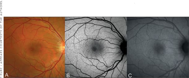 Figure 1. FAF imaging in normal subject A. Fundus photograph B. Mean and normalized FAF image recorded with the cSLO (Heidelberg Retina Angiograph, HRA 2, Heidelberg Engineering, Germany) C. FAF image obtained with the modified fundus camera (TRC-50IX, Topcon, Paramus, NJ). The FAF signal of the optic nerve head (absence of autofluorescent material) and of retinal blood vessels (absorption phenomena by blood contents) is decreased. Note the different distribution of intensity in the fovea between cSLO and fundus camera imaging. This most likely due to different degrees of absorption of the excitation light by macular pigment.