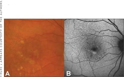 Figure 2. FAF imaging in early AMD A. Fundus photograph of the left eye shows early AMD with pigment abnormalities and multiple drusen. B. The corresponding FAF images reveals level of increased intensity below the foveal correlating with funduscopically visible soft drusen. This "patchy" pattern may represent a high-risk marker for progression to advanced AMD. Note also the presence of reticular drusen, visible as a prominent mosaic pattern over the whole posterior pole with multiple roundish spots with decreased intensities. A similar pattern with deep orange-yellowish spots but less evident is seen on the fundus photograph.