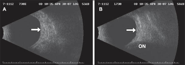 Figure 2. Five years post-treatment. A. transverse and B. longitudinal B-scans showing only mild irregular fundus thickening (less than 1 mm) in the area of the treated tumor (arrows). ON represents the shadow of the retrobulbar optic nerve.
