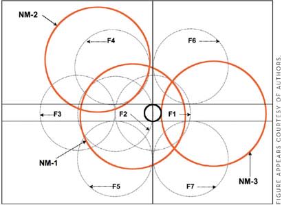 Figure 1. Joslin Vision Network Fields compared to Early Treatment Diabetic Retinopathy (ETDRS) 7-standard fields. NM-1 = JVN 45° nonmydriatic field 1, NM-2 = JVN 45° nonmydriatic field 2, NM-3 = JVN nonmydriatic field 45° 3. F1-F7 = ETDRS 30° mydriatic fields 1-7. JVN also captures 30° nonmydriatic images of ETDRS fields 1 and 2. All fields are imaged using a nonsimultaneous stereo image capture protocol.
