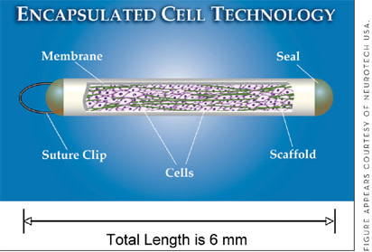 Encapsulated cell technology (ECT) was developed to treat diseases of the central nervous system (CNS)1 and the eye.2 ECT implants consist of living cells encapsulated within a semipermeable polymer membrane and supportive matrices. The encapsulated cells are genetically engineered to produce a specific therapeutic substance to target a specific disease or condition. Once surgically implanted into the CNS or eye, the semipermeable polymer membrane has 2 main functions: it allows the outward passage of the therapeutic product while protecting the encapsulated cells from rejection by the patient's immune system and also permits ready access to oxygen and nutrients.